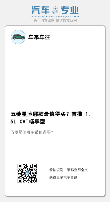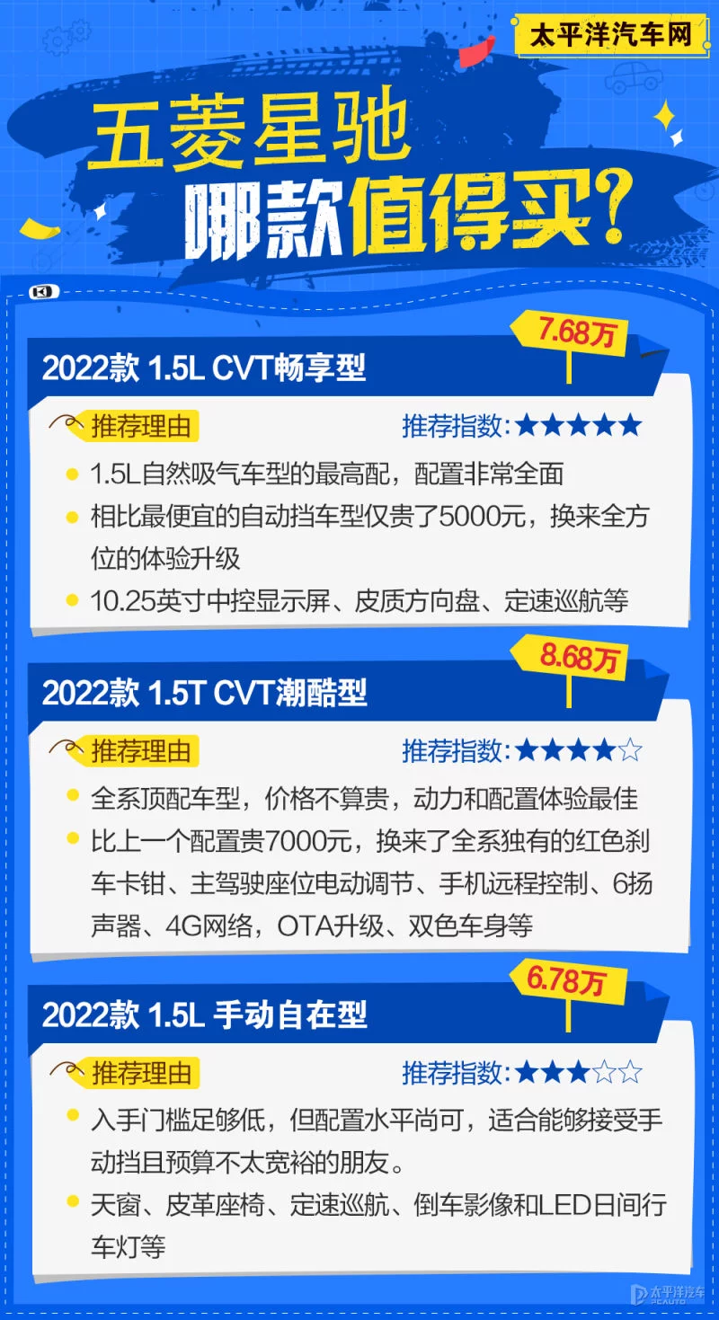 毫无疑问,五菱星驰的产品力还算不错,包括在外观内饰设计、空间上都有了较好的表现,符合第一次买车的人群对于一辆入门级小型SUV的期待。而具体车型来看,五菱星驰提供的6款配置版本也很好地对各个预算群体进行了精准划分,让不同需求的消费者都能轻松地选择到合适自己的版本。相较而言,最值得推荐性价比最高的,笔者个人认为是1.5L的顶配 CVT畅享型;而预算稍低的老司机,则可以考虑手动挡那款手动自在型;当然了,如果你预算充足,且对于个性化造型、舒适性、性能均有较高的要求,那么相信全系最高配的1.5T CVT潮酷型也不会让你失望。