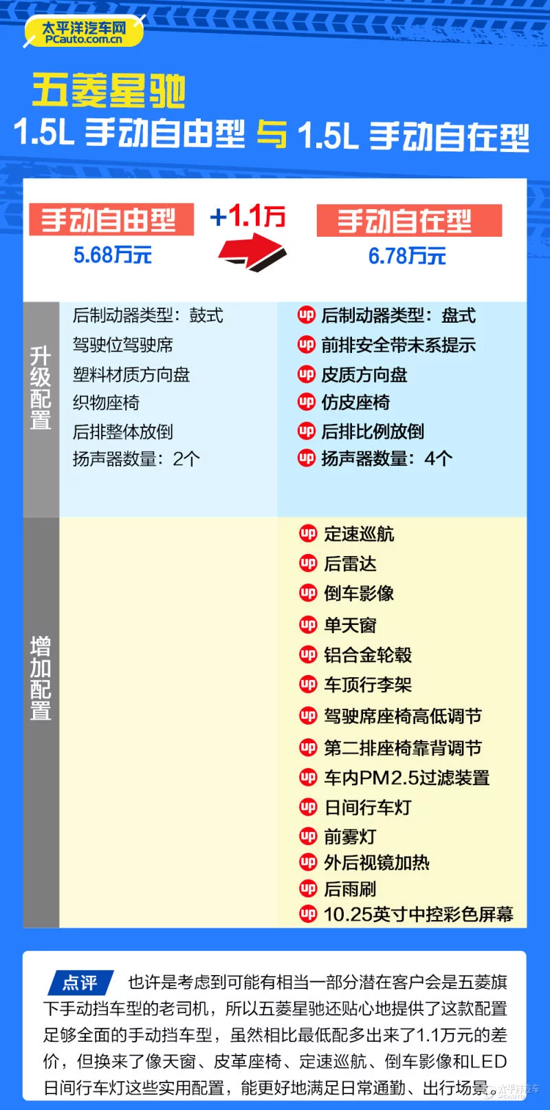 1.5L 手动自在型相比最低配车型价格贵了1.1万元,对于这个价位的车型来说这个价格梯度不算小,但具体配置来看你会发现,整体的配置提升非常明显,像天窗、皮革座椅、定速巡航、倒车影像和LED日间行车灯等等,这些都是日常使用度非常高的配置,足以应付日常的通勤、出行了,如果你是驾龄较长且习惯开手动挡的老司机,那么这个版本是值得考虑的。