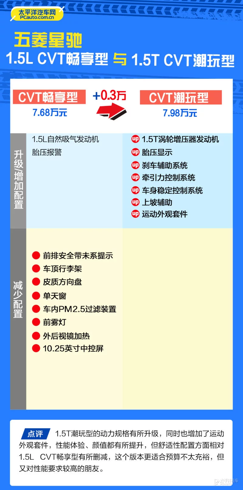1.5T潮玩型只比1.5L畅享型贵了3000元,主要是动力性能方面的提升,换装1.5T涡轮增压发动机后这套系统的最大功率由73kW提升至108kW,同时也增加了运动外观套件,颜值更出众。当然了,这个版本的整体配置相比1.5L CVT畅享型也有所删减,舒适性和可玩性都不如后者。