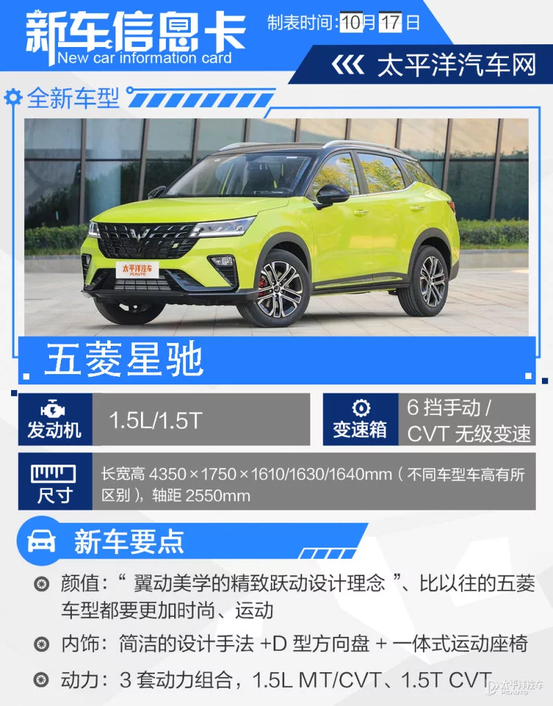自2020年五菱推出全球银标走向品牌焕新后,五菱便开始着重发力乘用车市场,相继推出了五菱凯捷、五菱星辰和五菱佳辰等车型,都是妥妥的爆款产物,可见其刀法精准。这一次,马不停蹄的五菱银标再次为大家带来了一台亲民SUV,它便是——五菱星驰。新车已经于9月28日正式上市,共推出6款车型,提供1.5L和1.5T两种动力供消费者选择,售价区间为5.68-8.68万。接下来,我们一起看看哪一款性价比最高?