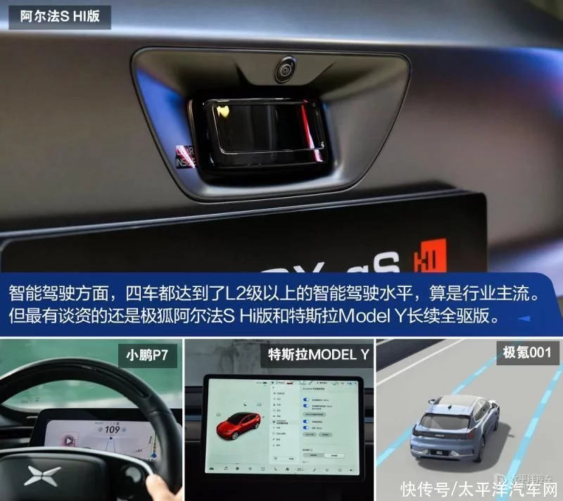 在智能驾驶方面,可能最有谈资的莫过于极狐阿尔法S 全新HI版和特斯拉Model Y长续全驱版,一个是华为智能解决方案赋能的杰出代表,一个是电动汽车智能驾驶的“鼻祖”和推动者。极氪001和小鹏P7也都达到了L2级以上的智能驾驶水平,算是行业主流。