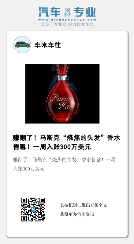 据外媒报道,马斯克卖出了3万瓶名为“烧焦的头发(Burnt Hair)”的香水。10月18日晚,马斯克在推特上宣布,这款香水现已售罄。