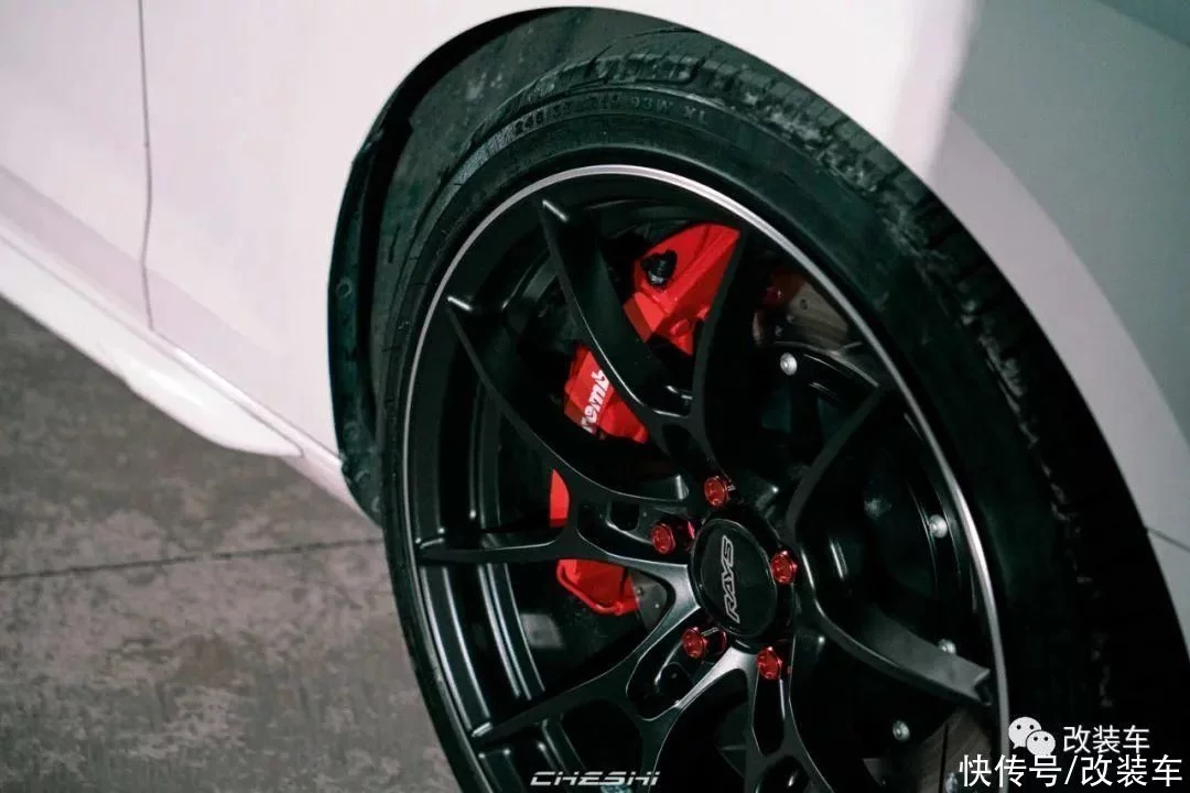 "上车之后原来的轮毂刹车显得很不搭,然后在朋友那里拿了一套闲置的19寸抛边轮毂和原厂高功4活塞刹车过渡,变成了现在的模样。"