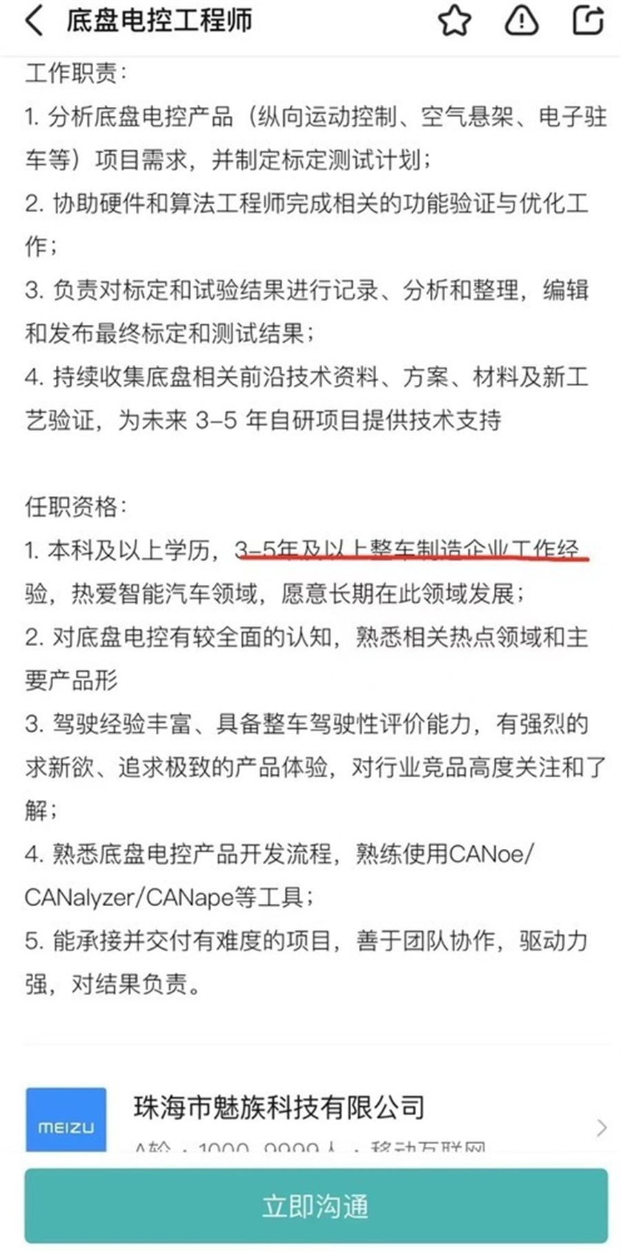 新能源汽车销售顾问、汽车向媒介公关已经涉及到了汽车的销售以及品牌营销层面,机械结构工程师以及底盘电控工程师等职位则涉及到了整车制造环节。值得一提的是,就底盘电控工程师这一职位而言,魅族科技要求主要工作职责是分析底盘电控产品、协助硬件和算法工程师完成相关工作、持续收集底盘相关前沿技术资料等等,并要求应聘员工拥有3到5年及以上的整车制造汽车工作经验。