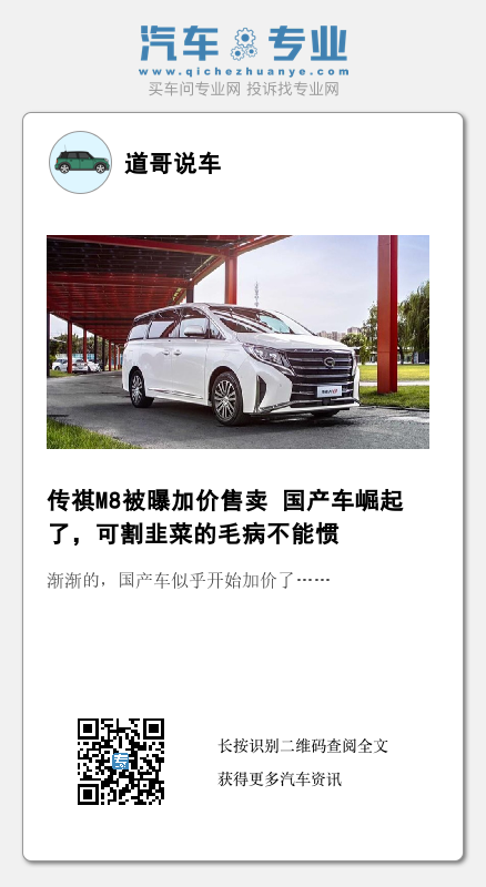 【文/道哥说车 听风吟】前不久,网上有预订新款M8的车主爆料传祺M8“出现加价5万元提车”行为,据爆料,如果想要按时提车需加装价值5万元的选装配件。这件事也被品牌方即广汽传祺关注到,广汽传祺发布声明称: