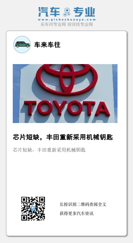 10月27日,丰田汽车表示,将在日本暂时用机械钥匙取代其提供的两个电子“智能”钥匙中的一个,以尽快将汽车交付日本消费者手中。
