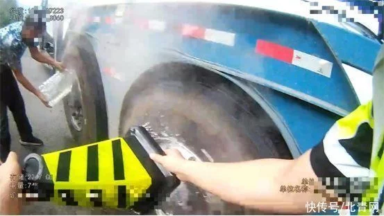 该车被护送到应急停车带后,一名民警在后方进行警戒,另一名民警用锥桶从储水桶中取水,给该车的轮胎降温。