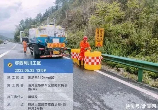 湖北高速交警在此提醒:山区高速长下坡路段较多,部分驾驶员因经验不足,极易出现轮胎过热引发自燃的现象,为服务群众,减少损失,湖北高速交警在长下坡的应急停车带设置了便民储水桶,方便群众给车辆降温加水、应急灭火。(楚天交通广播)