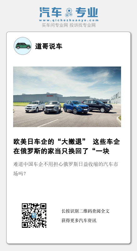 当然,比这更重要的一点或许还是国际局势或者说国际关系,毕竟在众多国家纷纷“制裁”俄罗斯的背景下,中国并没有“随波逐流”,在这场俄乌冲突带给俄罗斯汽车行业危机的背景下,中国车企自然也成为了受到影响最小的那部分。