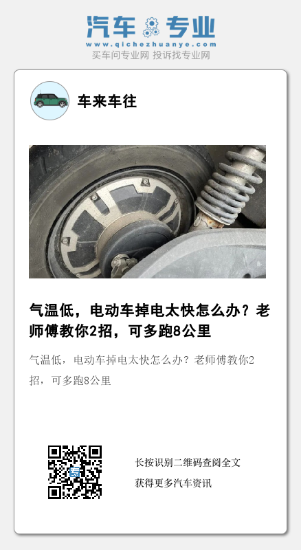 总之,在气温下降后,做到保持350kpa胎压与延长充电时间、电量剩余50%就进行充电,不亏电停放这两点,就能有效延长电动车续航,多跑8公里不再是什么难题。