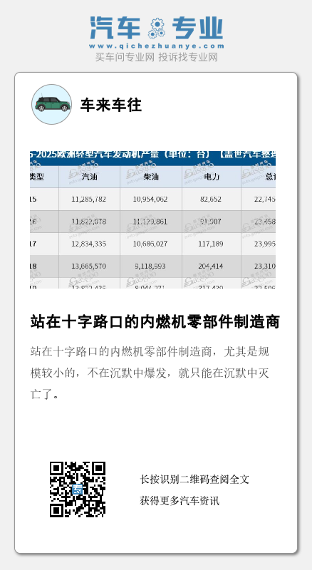 根据一家汽车市场咨询机构的数据,预计到2025年,欧洲轻型汽车(包括乘用车和轻型商用车)的发动机产量将从2017年近2400万台的高点降至约1930万台,下降约20%。