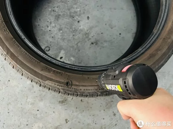 拆下的轮胎,我也用不上,为了避免被人去翻新处理,我特意这次带上了Worx手枪钻,在换下的轮胎胎侧钻2个洞