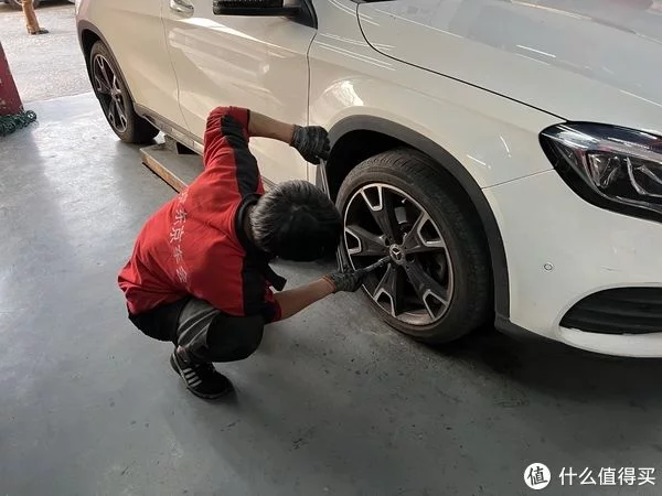 小哥先把4条轮胎上的螺栓拧松(包括防盗螺栓)