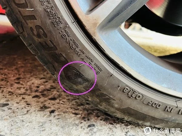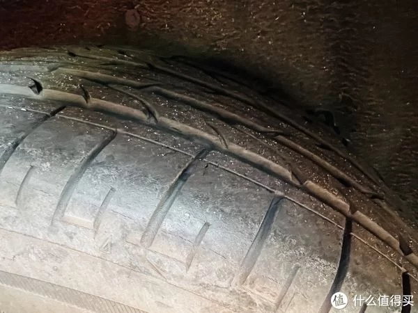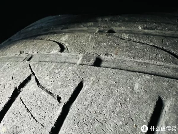 左后,这条胎至少补过5次了。轮胎本身龟裂情况还不算明显。胎侧磨损也不严重,相较于我激进驾驶风格下仅跑了2年不到8000KM的PS4S,好太多了。