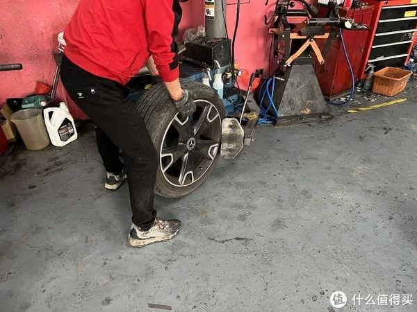 全部都装上,拧好螺栓后把车子放到地面上,再进行一次螺栓紧固,可惜我并没有看到他们用扭力扳手。最后一步,再次用充气机进行放气(装轮胎时特意全部都打高了气压值)。