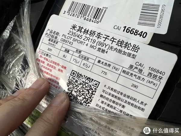 标签,米其林性能胎 Pilot Sport 4,作为高端街胎,口碑一直不错。235/45R19,99Y(最大承重775kg,最大时速300KM/H),MO 表示奔驰专用款。