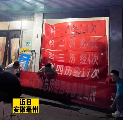近日,安徽亳州。小伙驾考四年终于喜提驾照,朋友们拉横幅庆祝:科一14次,科二4次,科三4次,科四17次。