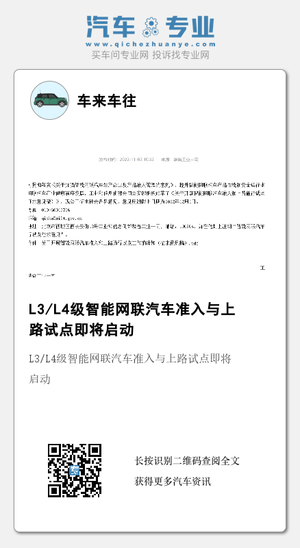 日前,工信部会同公安部组织起草了《关于开展智能网联汽车准入和上路通行试点工作的通知(征求意见稿)》,11月2日下发通知即日起起公开征求社会各界意见。意见反馈截止日期为2022年12月1日。
