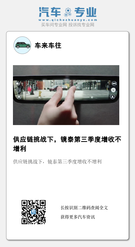据外媒报道,汽车后视镜供应商镜泰表示,供应链挑战导致其第三季度利润下降,但销售额较去年同期有所增长。