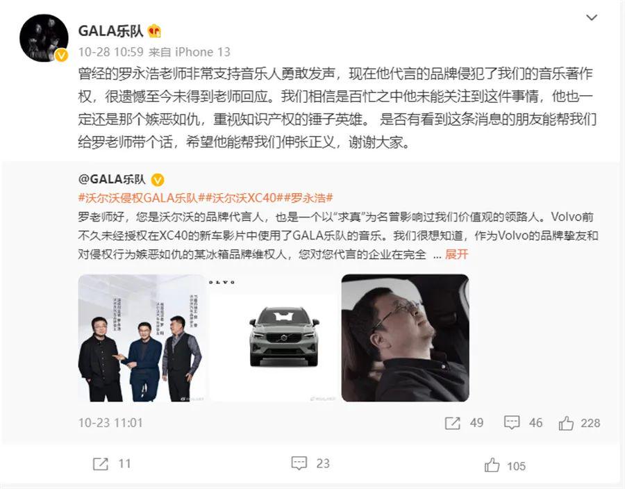有意思的是,沃尔沃的代言人包括罗永浩与罗翔。一个是以“求真”为价值观的意见领袖,一个则是有“法外狂徒”之称法律专业教授。但沃尔沃的做法,却多少与两位代言人的形象有些出入。GALA乐队在维权过程中也两次提到了沃尔沃的品牌代言人罗永浩,并称,“曾经的罗永浩老师非常支持音乐人勇敢发声,现在他代言的品牌侵犯了我们的音乐著作权很遗憾至今未得到老师回应。”不少网友也在看到相关话题后喊话罗翔“代言的品牌涉侵权,怎么维权?”