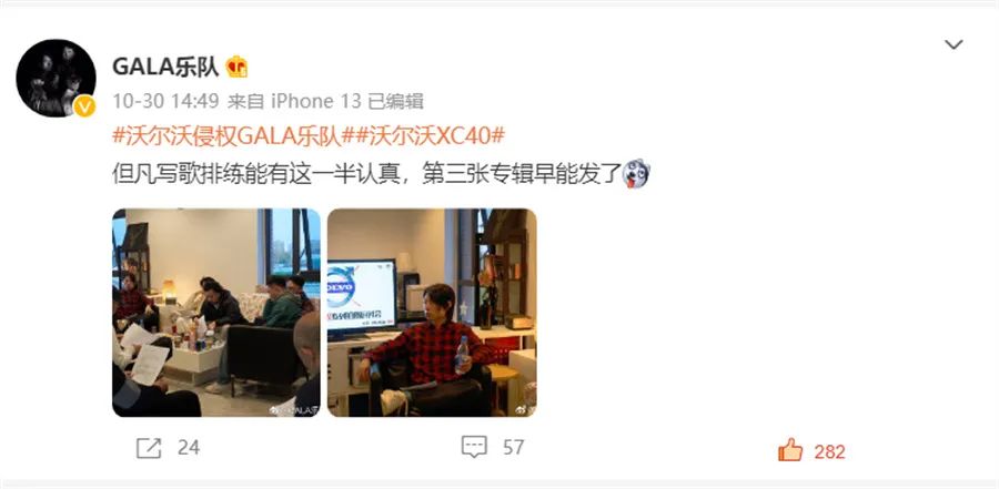 值得关注的是,如果所有人对于著作权都持冷漠态度,文化创作的积极性也或许会受到打击,10月30日,GALA乐队微博发布了“沃尔沃维权系列拍摄研讨会”的图片,配文则是“但凡写歌排练能有这一半认真,第三张专辑早能发了”,上述吉他手表示,“这看似发牢骚的话,可能背后的深意是费这么大劲维权还不如去搞创作,音乐人的无奈有被戳中”。