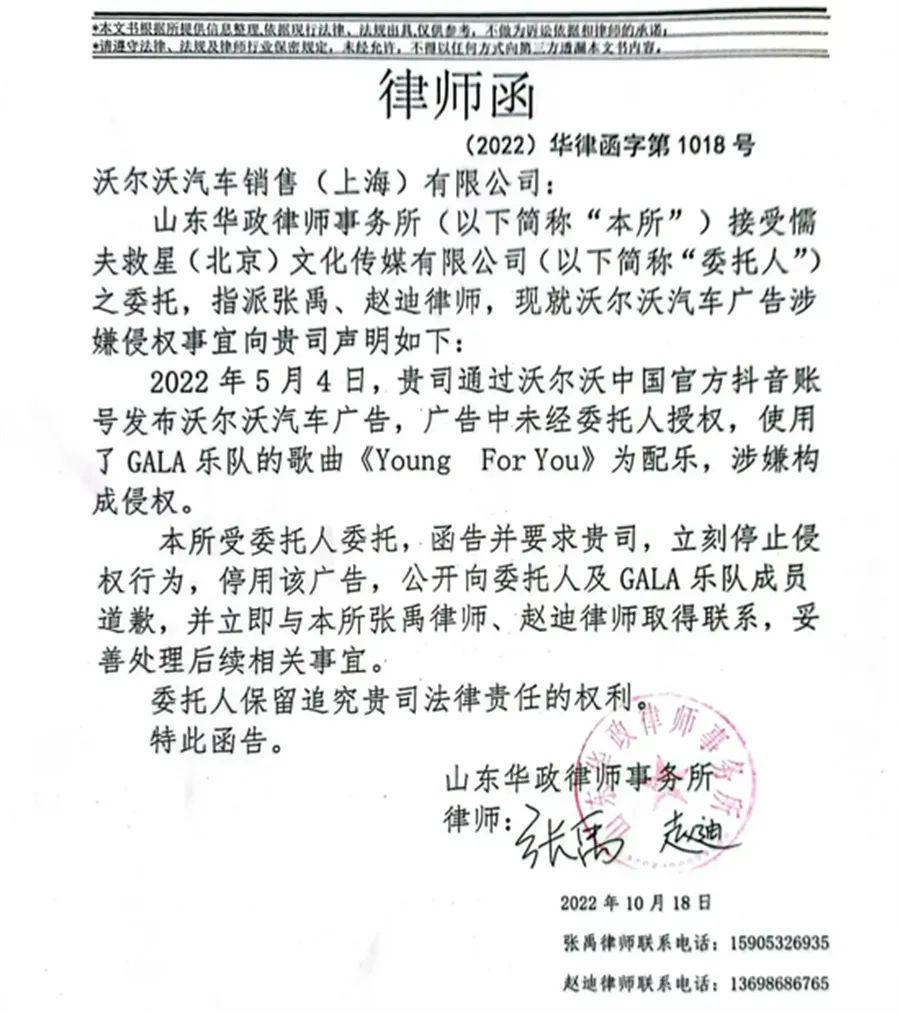 事实上,歌曲被穿插在广告片、直播、短视频中被侵权的事件并不少见,但侵权者被揪出来,承认却不道歉、不赔偿、不表态的事情就比较少见了。但这事,被GALA乐队赶上了,侵权者还是用户画像为“高知人群”的沃尔沃。