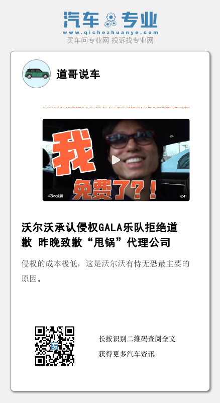 对比来看,尽管是二线豪华品牌,但沃尔沃的“骨气”似乎却比奥迪要硬上不少。10月28日,GALA乐队微博发布视频诉侵权过程,并采访了相关沃尔沃车主的态度同时,乐队主唱苏朵也提到,这么多年希望音乐人们的知识产权得到保护,但是并没有本质上的改善。很多品牌与他们合作都是走流程,但沃尔沃这样的做法他第一次看到,“这都2022年了,怎么还会有这种事情发生”。