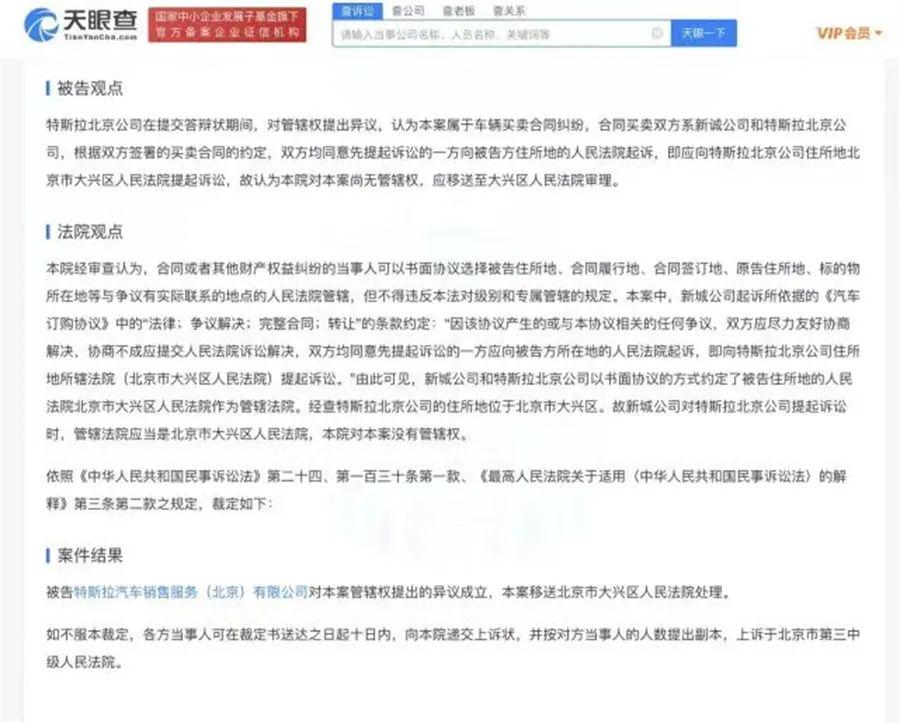 特斯拉北京公司对管辖权提出异议,认为根据合同,应向特斯拉北京公司住所地北京市大兴区人民法院提起诉讼。北京市朝阳区人民法院认为,被告特斯拉汽车销售服务(北京)有限公司对本案管辖权提出的异议成立,本案移送北京市大兴区人民法院处理。