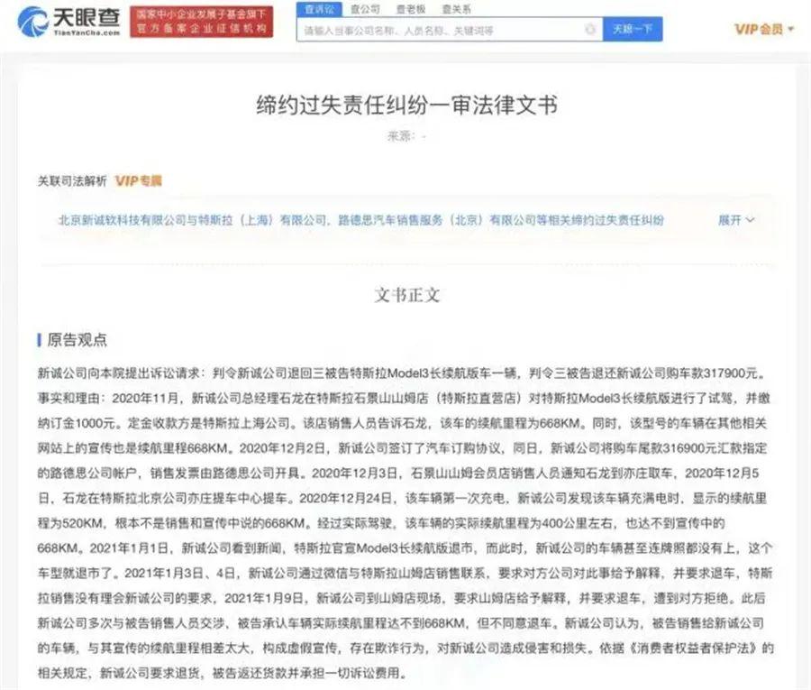 文书显示,原告新诚公司诉称,此前,该公司总经理石某在特斯拉石景山山姆店试驾Model3长续航版并缴纳购车订金,销售人员称该车续航里程为668KM,其他相关网站上的宣传也是668KM。新诚公司签购车协议取车后,发现车辆显示的续航里程为520KM,实际驾驶续航里程为400公里左右,达不到宣传中的668KM。