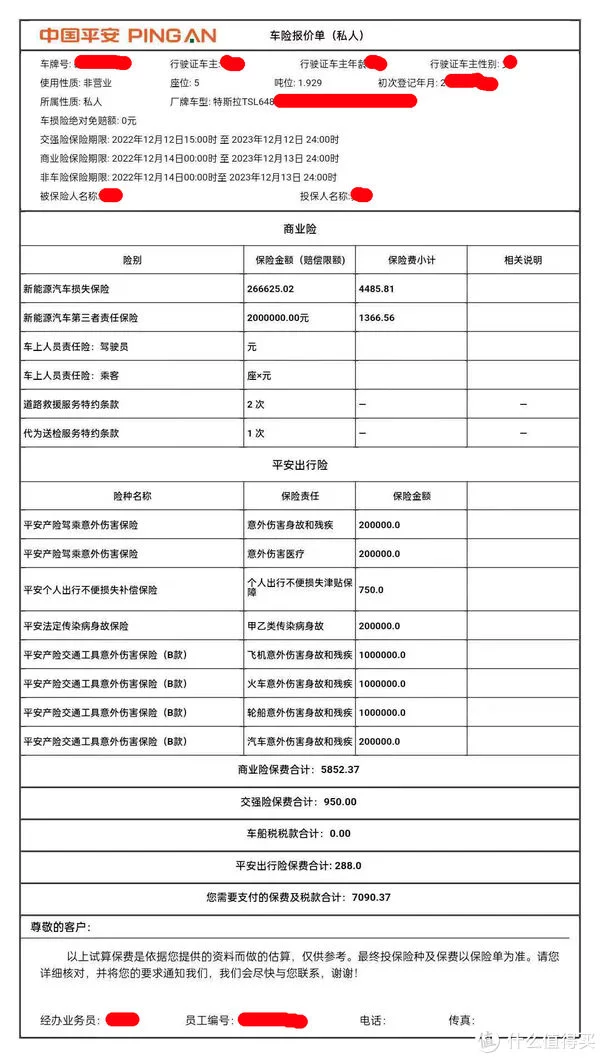 悲催的故事讲完了,说下这次保险续费的报价。原本以为出险两次,总额1.8万,续保费用会大涨。结果按照去年200万三者的险种续费,报价是7090.37元,跟去年几乎持平,额外赠送一个面的特斯拉直营钣喷中心喷漆和一次车内臭氧杀菌。此外十月本来有500元优惠,我当时想等年底出更大的优惠就没续,结果11月保险员说200万三者取消了现金优惠,只有300万三者能优惠668元,最后折合7091.38元,只比200万三者贵1快1毛钱,估计我会续300万三者了。对了,这个保费组合中有个288元的“平安出行险”可以不买,但它跟赠送的一面原厂喷漆(特斯拉4S店价值千元)捆绑在一起了,所以我只能选择买了。