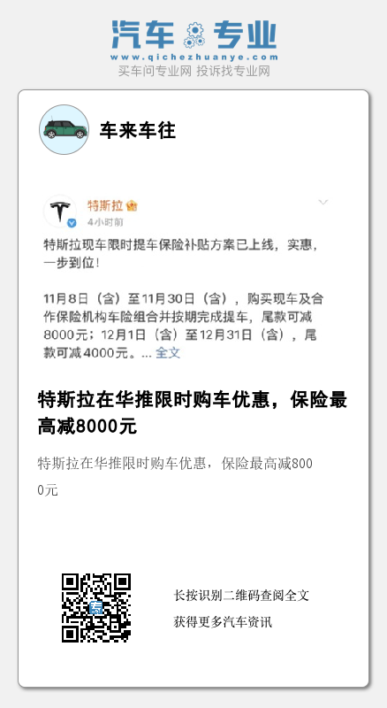 11月8日,特斯拉表示,该公司暂时调整了中国地区的购车保险优惠政策,提高了对11月30日之前下单的汽车保险优惠,但降低了12月份下单的保险优惠,此举旨在敦促消费者提前下单。