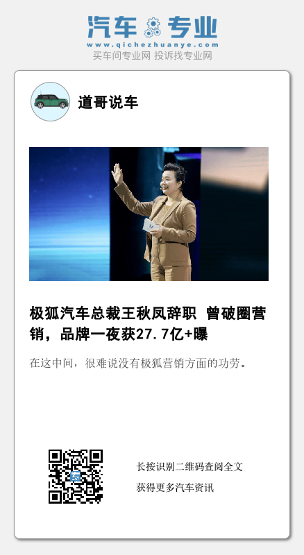 【文/道哥说车 听风吟】近日,有消息称,北汽新能源股份有限公司副总经理、极狐汽车总裁王秋凤因个人原因辞职。