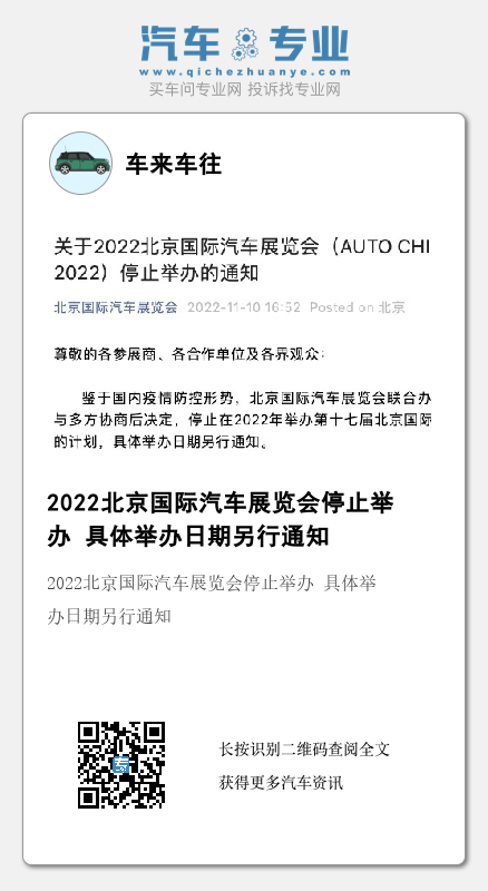 11月10日,北京国际汽车展览会官微发布消息称,鉴于国内疫情防控形势,北京国际汽车展览会联合办展各单位经与多方协商后决定,停止在2022年举办第十七届北京国际汽车展览会的计划,具体举办日期另行通知。