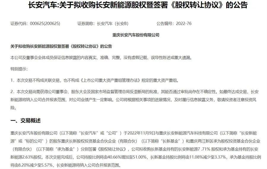 【文/道哥说车 听风吟】11月10日,长安汽车发布公告称,拟收购长新基金持有的长安新能源7.71%股权和承为基金持有的长安新能源2.63%股权。本次交易完成后,公司持股比例将由40.66%增加至51%,长安新能源将纳入公司合并报表范围。