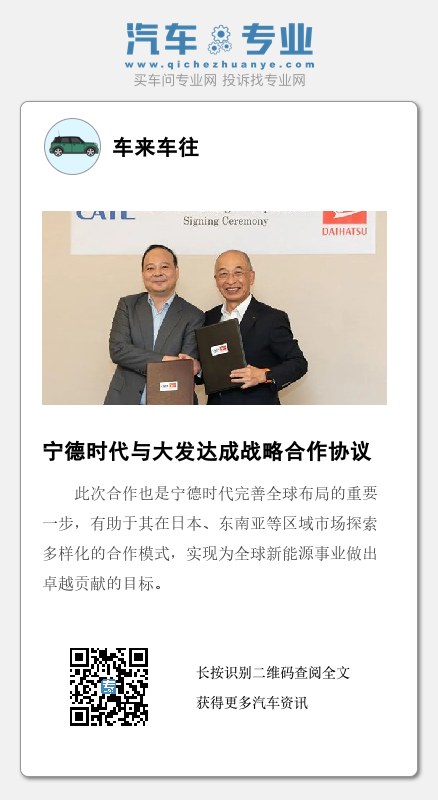 大发是小型车领域的领导者,也是日本历史最为悠久的汽车生产商之一。根据协议,宁德时代将为大发的电动车型提供稳定的动力电池供应。双方将发挥各自优势,推进CTP(高效成组)及BMS(电池管理系统)等先进电池技术的落地应用。