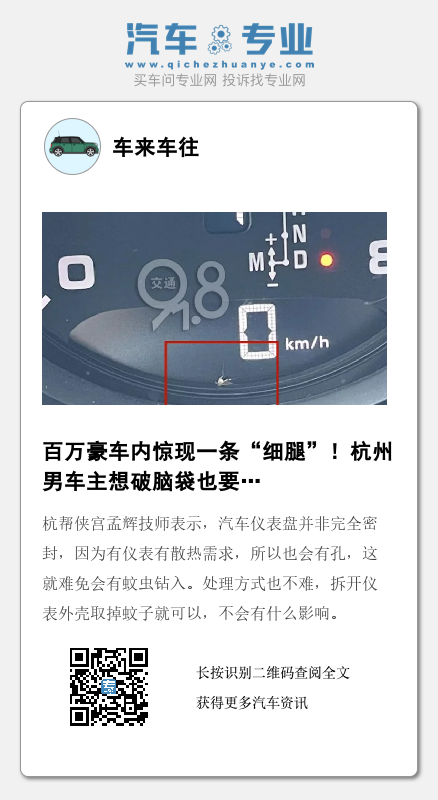 杭帮侠宫孟辉技师表示,汽车仪表盘并非完全密封,因为有仪表有散热需求,所以也会有孔,这就难免会有蚊虫钻入。处理方式也不难,拆开仪表外壳取掉蚊子就可以,不会有什么影响。