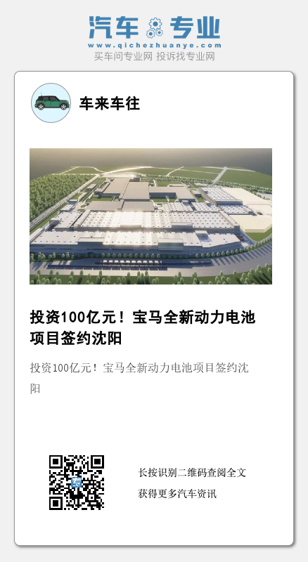 11月13日,据沈阳发布消息,宝马全新动力电池项目近日在沈阳签约。该项目由华晨宝马进行投资,投资总额约为100亿元人民币。这是继华晨宝马生产基地大规模升级项目(简称“里达工厂”)总投资150亿元人民币之后的又一笔重大投资。