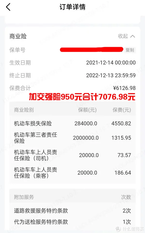 先说第一年保费,貌似特斯拉首保必须在店购买,即便先买个交强险、拿到车后再去外面买商业险都不行(外面保险员说买不了),我是先在店里买的950元交强险,后面又回到店里买商业险6126.98元(三者200万),合计费用7076.98元。