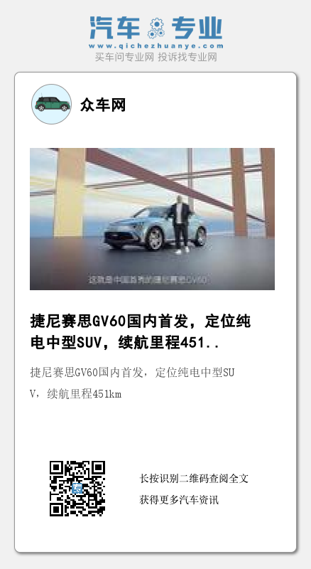 11月10日,捷尼赛思GV60正式首发亮相,新车定位纯电中型跨界SUV,基于E-GMP电动平台打造,综合续航里程451公里。此外,捷尼赛思官方还宣布,到2025年起所有新车型都将成为纯电车型。