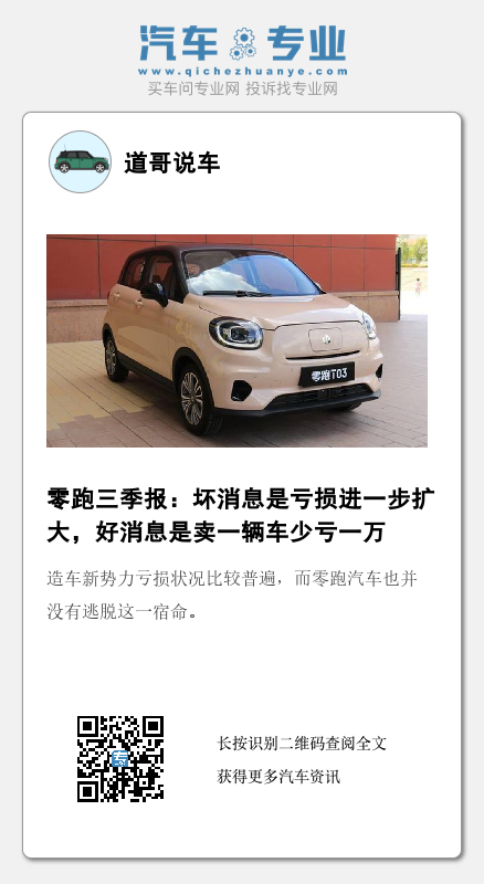 据了解,零跑C11售价为17.98-23.98万,相比零跑冲量车型零跑T03(售价7.95-9.65万元)来说,价格提高了10万不止。而这也让零跑汽车的单车亏损进一步缩小。通过与零跑汽车营收、利润数据以及交付量数据综合对比计算,零跑汽车第三季度单车收入达12.0万元,相比上半年9.77万元大幅度提升,单车亏损则为3.76万元,与此前单车亏损4.7万元相比也有所改善。