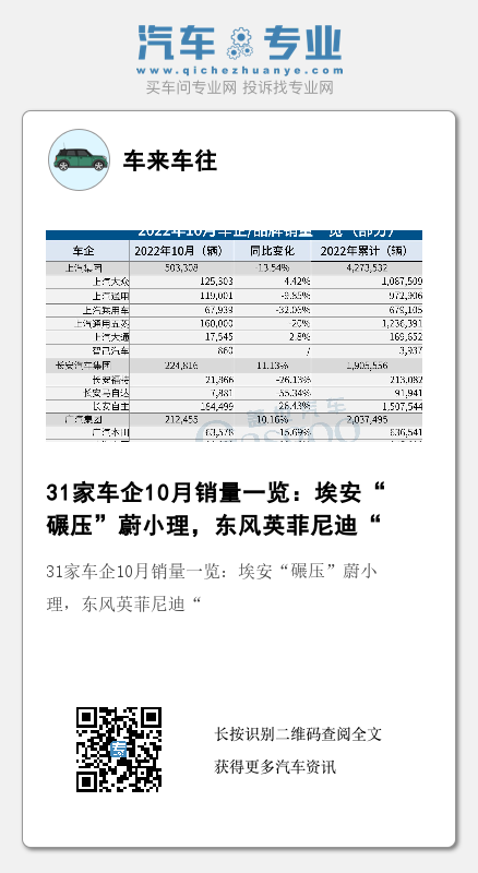 <> //百度自动提交js 20180706 mark //(function () { // var bp = document.createElement(''); // var curProtocol = window.location.protocol.split(':')[0]; // if (curProtocol === 'https') { // bp.src = 'https://zz.bdstatic.com/linksubmit/push.js'; // } // else { // bp.src = 'http://push.zhanzhang.baidu.com/push.js'; // } // var s = document.getElementsByTagName("")[0]; // s.parentNode.insertBefore(bp, s); //})(); // 百度统计 var _hmt = _hmt || []; (function () { var hm = document.createElement(""); hm.src = "//hm.baidu.com/hm.js?c7646b8a972941fe66287f9bea6d2728"; var s = document.getElementsByTagName("")[0]; s.parentNode.insertBefore(hm, s); })(); //SEM 统计 var _hmt = _hmt || []; (function () { var hm = document.createElement(""); hm.src = "https://hm.baidu.com/hm.js?835dca2799ccc3993f01ee266f5c338f"; var s = document.getElementsByTagName("")[0]; s.parentNode.insertBefore(hm, s); })(); > <> window.dataLayer = window.dataLayer || []; function gtag() { dataLayer.push(arguments); } gtag('js', new Date()); gtag('config', 'UA-183381321-1'); > <> $(function () { $(".cy_cmt_count").hide(); $("#changyan_count_unit").hide(); getURl(); var articleid = $("#ArticleId").val(); if (IsWap() &&articleid != null &&articleid != "undefined" &&articleid != "") { var url; if(window.location.h.toLowerCase().indexOf("newsflash")>0) { url = "https://m.gasgoo.com/newsflash/" + articleid + ".html"; }else { url = "https://m.gasgoo.com/news/" + articleid + ".html"; } window.location.h = url; } //匹配出文章中h为空的a标签颜色改为#3f3b3b $('#ArticleContent a').each(function () { if ($(this).attr("h") == undefined || $(this).attr("h") == "") { $(this).css("color", "#3f3b3b"); } }); //匹配出文章中所有为空p标签,并删除 暂时弃用,此方法会导致图片下面文字过近 //$('#ArticleContent p').each(function () { // if ($(this).html() == undefined || $(this).html() == "") { // $(this).remove(); // } //}); }); function getURl() { var articleId = $("#ArticleId").val();//根据 隐藏的标签得到 var from = GetQueryString("From"); var systemPlat = GetQueryString("systemPlat"); var userId = GetQueryString("userId"); var isFromAuto = "Y"; //get login user var loginId = ""; var loginCookie = getCookie('GASGOO_USER'); if (loginCookie != undefined) { loginId = loginCookie.split('|')[2]; } if (!isNotEmpty(systemPlat)) { systemPlat = 'AUTO'; } if (!isNotEmpty(from)) { from = 'PC'; } if (!isNotEmpty(userId)) { userId = ''; } if (systemPlat.toUpperCase() != "AUTO") { isFromAuto = "N"; } //正式 var url = "/m/pages/PVCount.aspx?ArticleId=" + articleId + "&From=" + from + "&SystemPlat=" + systemPlat + "&UserId=" + userId + "&LoginId=" + loginId + "&IsFromAuto=" + isFromAuto; $.ajax({ url: url, type: 'GET', dataType: 'jsonp', // 处理Ajax跨域问题 success: function (data) { //处理成功 } }); } //根据ID获取URL参数 function GetQueryString(name) { var reg = new RegExp("(^|&)" + name + "=([^&]*)(&|$)"); var r = window.location.search.substr(1).match(reg); if (r != null) return unescape(r[2]); return null; } function isNotEmpty(str) { return (str !== null &&str !== "" &&str !== undefined); } function IsWap() { var agent = navigator.userAgent.toLowerCase(); if (agent.indexOf("ipad") != -1 || agent.indexOf("kindle") != -1 || agent.indexOf("touchpad") != -1) { return false; } if (agent == "" || agent.indexOf("mobile") != -1 || agent.indexOf("mobi") != -1 || agent.indexOf("nokia") != -1 || agent.indexOf("samsung") != -1 || agent.indexOf("sonyericsson") != -1 || agent.indexOf("mot") != -1 || agent.indexOf("blackberry") != -1 || agent.indexOf("lg") != -1 || agent.indexOf("htc") != -1 || agent.indexOf("j2me") != -1 || agent.indexOf("ucweb") != -1 || agent.indexOf("opera mini") != -1 || agent.indexOf("mobi") != -1) { //终端可能是手机 return true; } return false; } > 近日,各大车企/品牌陆续公布10月销量成绩。从盖世汽车汇总的数据来看,该月,在6.9%的整体市场增幅下,各大车企表现参差不齐,一些车企跑赢大盘,甚至翻番上涨,另一些车企则状态不佳。
