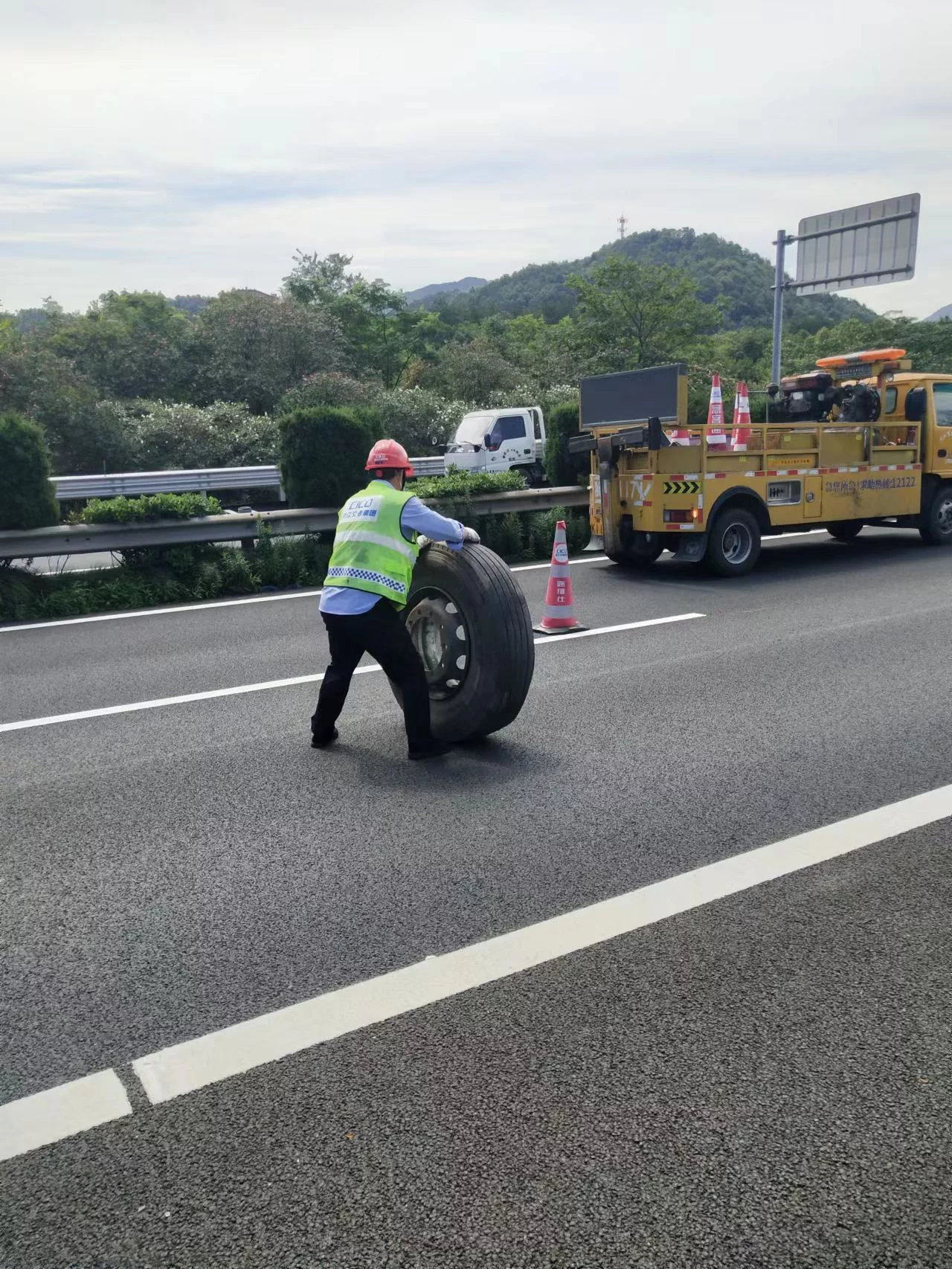浙江省交通集团丽水管理中心的施救人员在回程的路上,突然发现前面躺着一只大型货车轮胎,路过车辆纷纷避让。随即,两名施救人员在轮胎后方后方摆设反光锥筒渠化出安全区域,一人挥舞小红旗进行后方预警,提醒过往车辆注意避让,一人将200斤重的轮胎扶正,然后又乘着车流空档将轮胎快速滚至硬路肩上排除了险情,并将这一情况通报给了监控分中心。