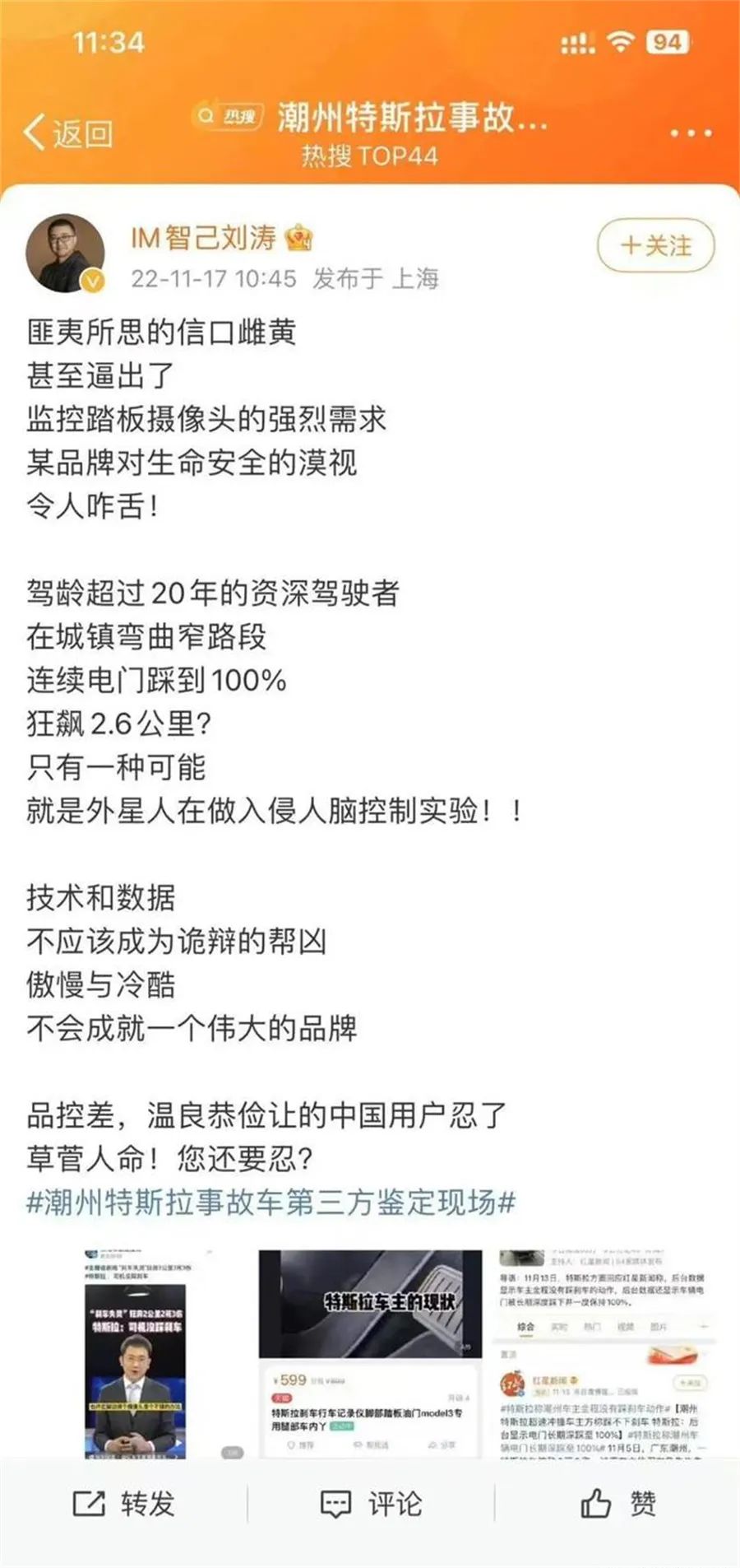 刘涛发文称,匪夷所思的信口雌黄,甚至逼出了监控踏板摄像头的强烈需求,某品牌对生命安全的漠视令人咋舌!驾龄超过20年的资深驾驶者在城镇弯曲窄路段连续电门踩到100%,狂飙2.6公里?只有一种可能,就是外星人在做入侵人脑控制实验!技术和数据,不应该成为诡辩的帮凶,傲慢与冷酷不会成就一个伟大的品牌,品控差,温良恭俭让的中国用户忍了,草菅人命!您还要忍?