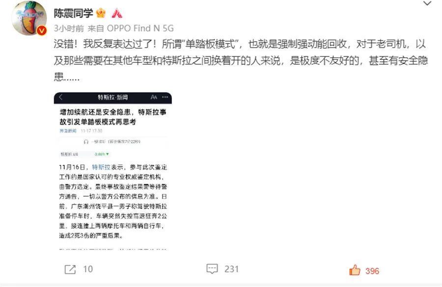 知名车评人陈震在其微博中也表示,所谓“单踏板模式”,也就是强制强动能回收,对于老司机,以及那些需要在其他车型和特斯拉之间换着开的人来说,是极度不友好的,甚至有安全隐患……