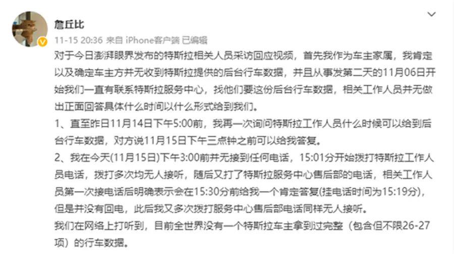 据涉事车主家属詹先生11月15日晚发布微博显示,其在11月15日前并未收到特斯拉提供的后台行车数据,并于11月15日当天多次联系特斯拉方面未果。而对于潮州警方委托第三方鉴定机构对车祸车辆进行鉴定,涉事家属表示不认同。潮州警方则表示,此次第三方鉴定正常进行,如果亲属不认可,可以进行申诉。