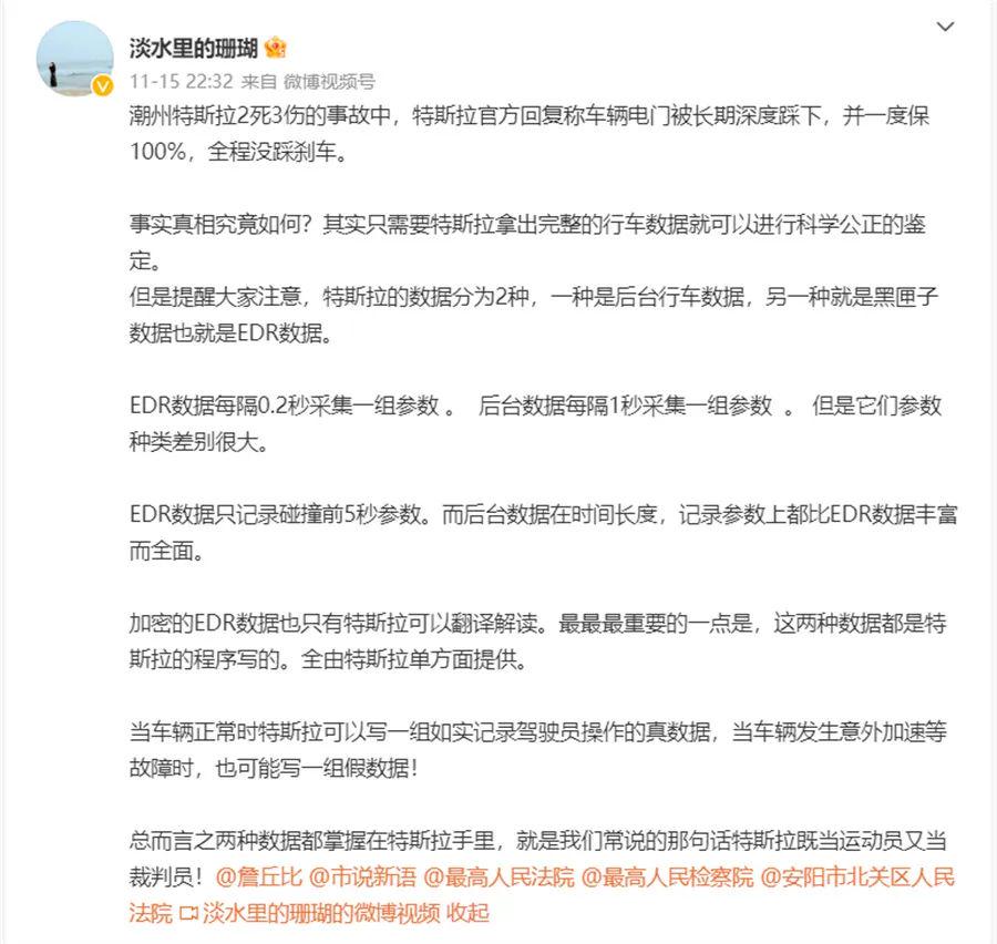 尽管结果尚未判定,但网友及业内人士已经纷纷对此发表评论,而这其中,如刘涛般指责的声音并不少见。其中,上海车展维权女车主也在个人微博发表了自己的看法。其表示,潮州特斯拉2死3伤的事故中,事实真相其实只需要特斯拉拿出完整的行车数据就可以进行科学公正的鉴定。