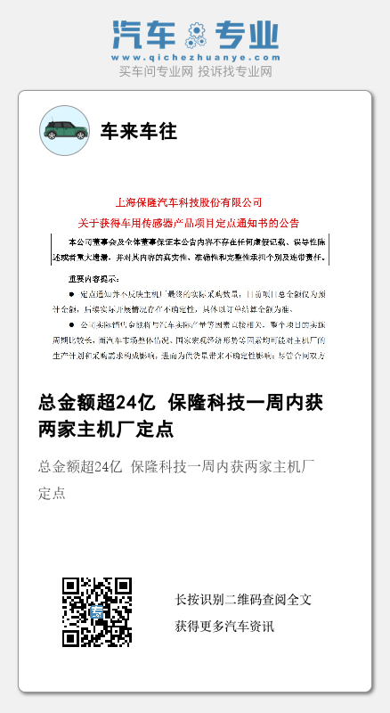 保隆科技在公告中表示,公司现有的车用传感器产品包括压力、光雨量、速度、位置、加速度、电流类和刹车磨损传感器等。目前车用传感器产品占公司营业收入总额比重较小,公司本次成为此客户全新平台项目刹车磨损传感器的产品供应商,将有助于提升公司欧洲车用传感器工厂的运营成效,并对公司进一步拓展全球车用传感器业务产生积极作用。
