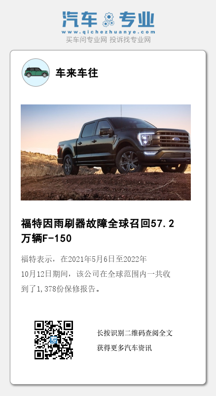 据外媒报道,福特汽车公司正在全球范围内召回超过57.2万辆F-150皮卡,原因是这些车辆在某些情况下,雨刷器电机会停止工作,导致能见度降低,增加碰撞的风险。