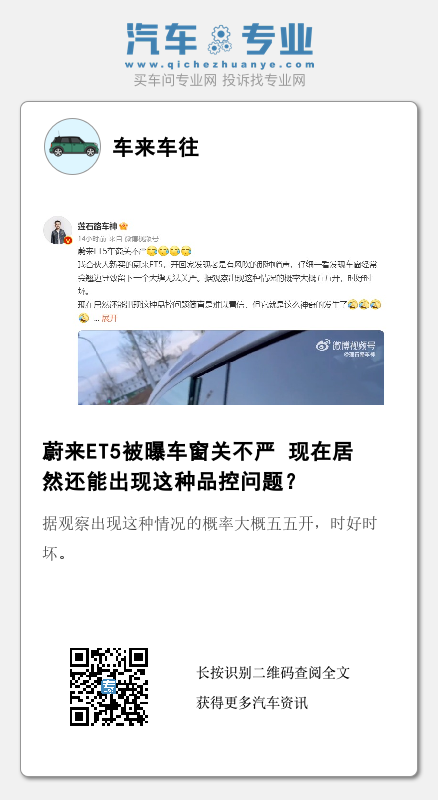 《汽车专业网》消息,日前有博主爆料,蔚来ET5出现车窗关不严问题。
