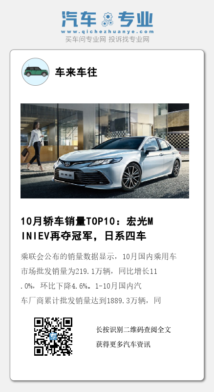 乘联会公布的销量数据显示,10月国内乘用车市场批发销量为219.1万辆,同比增长11.0%,环比下降4.6%。1-10月国内汽车厂商累计批发销量达到1889.3万辆,同比增长14.0%。